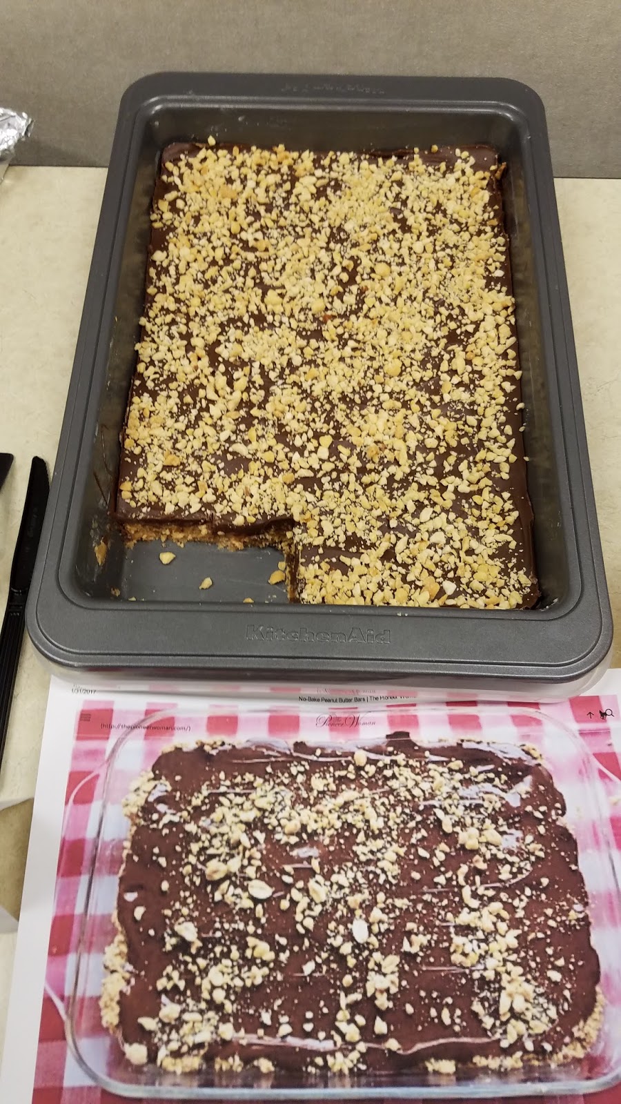 The Pioneer Woman's No-Bake Peanut Butter Bars made by Trudy. She used half the amount of mini chocolate chips, but recommends cutting out the mini chocolate chips. She thinks its chocolatey enough with the 2 cups of chocolate chips for the top. With peanut butter and chocolate, what's not to love about this dessert!